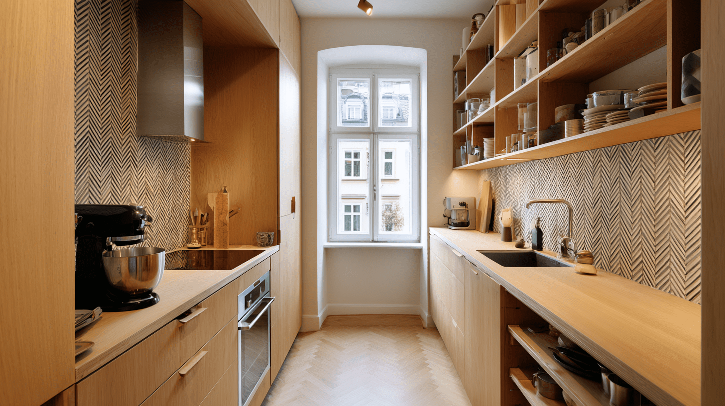 In Germany, where the combination of oak or light wood cabinetry with a single consistent stone-effect or ceramic countertop running all the way to the backsplash is both practical and increasingly standard, this is the material combination that consistently makes a small kitchen feel well-considered rather than compromised.