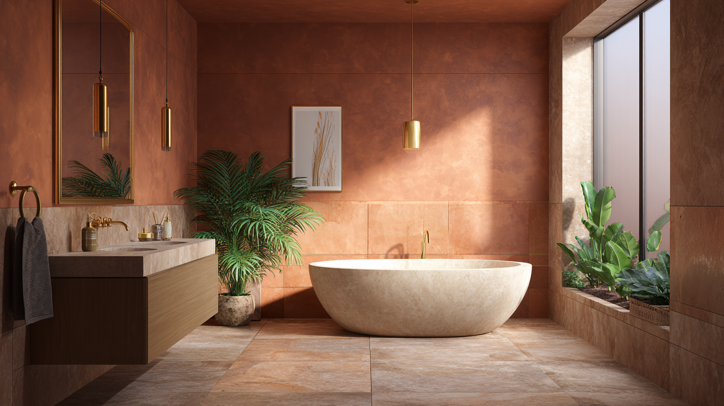 The direction now is warmth. Earthy tones — soft clay, terracotta, warm sand, sage green, muted olive — are taking over as the primary bathroom palette. These colours have a grounding effect that all-white lacks. They make the bathroom feel like a place to genuinely rest rather than a room to get through.